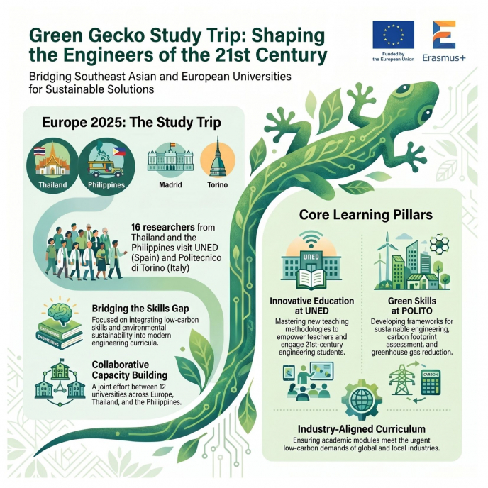 GREEN GECKO aims to strengthen engineering education in sustainability across eight universities in South-East Asia, particularly in Thailand and the Philippines. In this context, the project places strong emphasis on the development of innovative teaching methods, through the design of new educational approaches and learning materials capable of addressing the needs of industry and society, while fostering stronger integration between universities, industry, and local stakeholders.